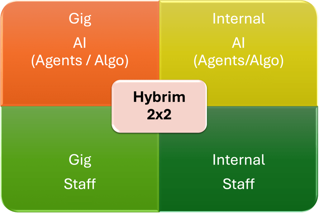 Hybrim—short for Hybrid Intelligence Matrix—is a revolutionary concept designed to address the complex challenges of modern business by integrating four critical dimensions: Human Talent and AI Agents on one axis, and Internal Teams and Gig Resources on the other.