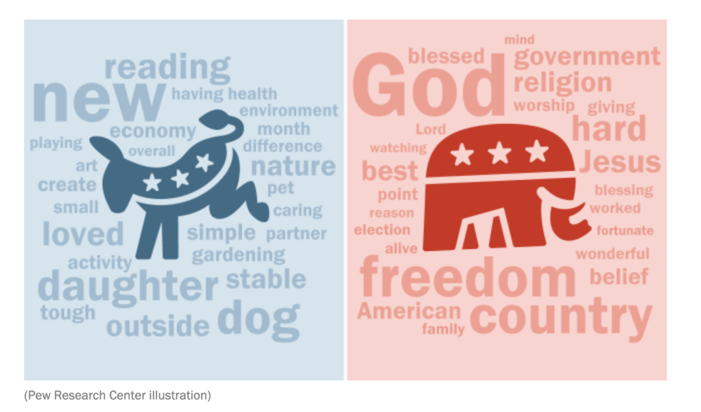 This image from the Pew Research Center visually represents the different values and priorities often associated with supporters of the two major U.S. political parties, Republicans and Democrats, by using word clouds.