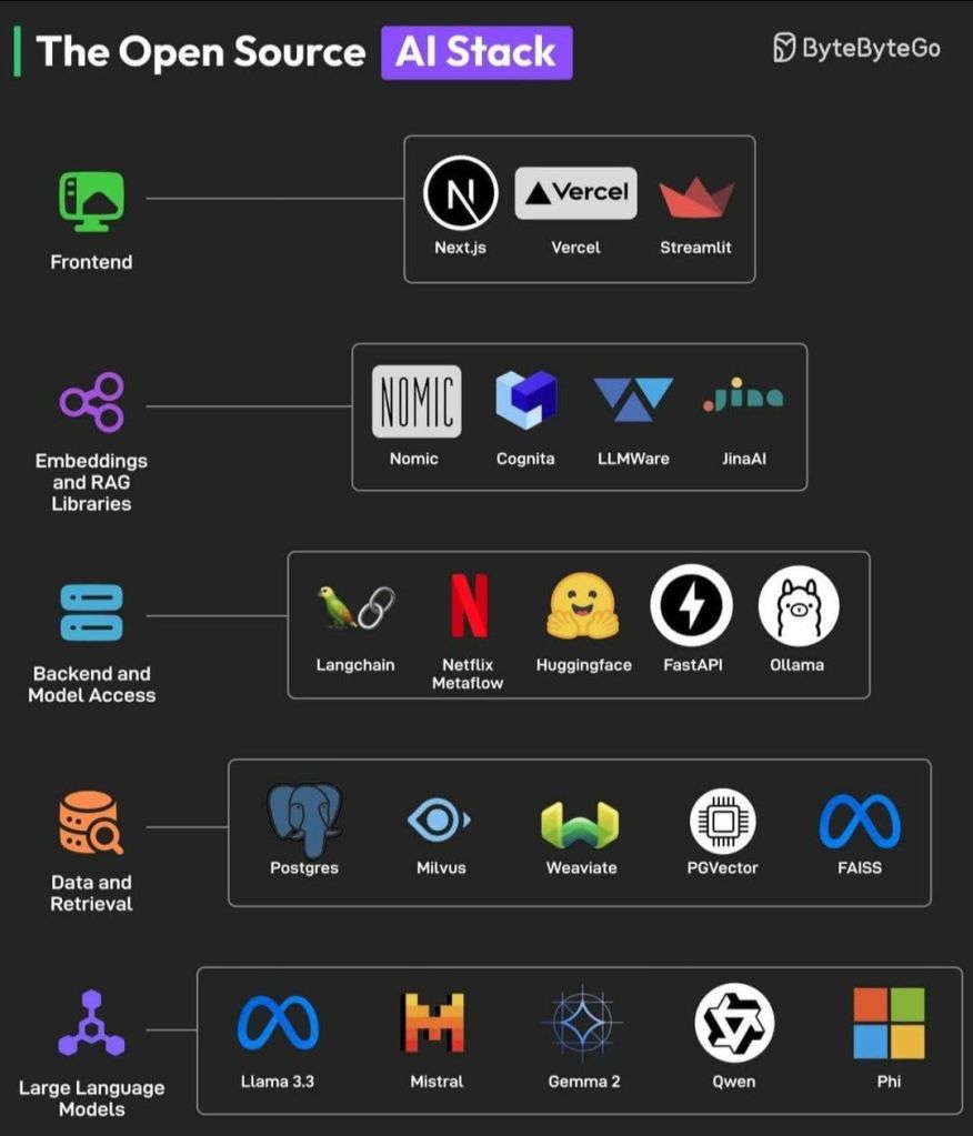 - ByteByteGo’s AI Stack (https://blog.bytebytego.com/p/ep146-the-open-source-ai-stack)